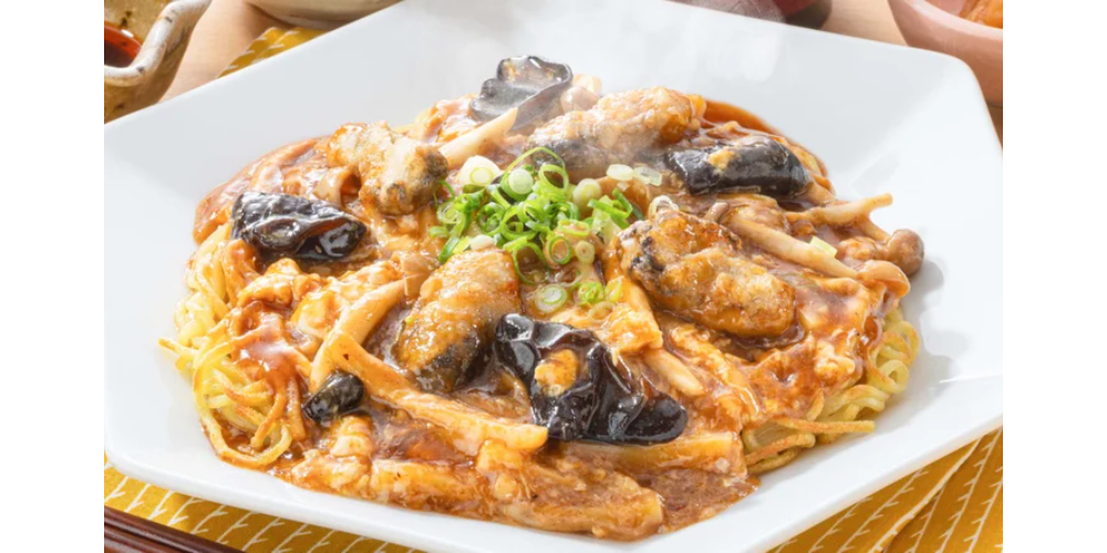 一つは、「牡蠣の酸辣あんかけ焼きそば」(定食価格 税込1,530円)です。牡蠣の旨みに、酸味と辛みを効かせた酸辣湯あんが、香ばしい焼きそば麺にとろりと絡む贅沢な一皿です。しめじや筍などの食感がアクセントになっており、別添えの特製ラー油で味の変化も楽しめます。