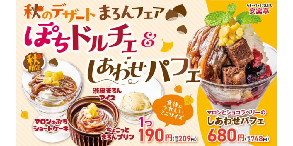 株式会社安楽亭は、2025年10月8日(水)より秋限定の「秋のデザート まろんフェア」を開催し、「マロンとショコラベリーの しあわせパフェ」と秋限定の「ぽちドルチェ」3種を期間限定で販売します。