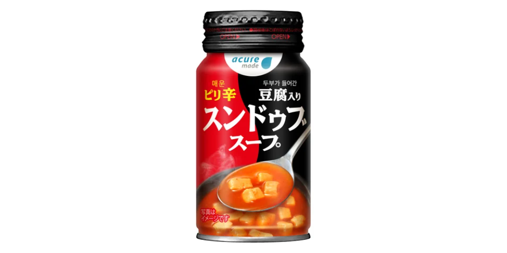 アキュアメイドのスープ飲料としては約3年ぶりとなる新商品「スンドゥブスープ」は、あさりの風味としっかりとした辛さが特長です。さらに豆腐が入っているため、手軽に小腹を満たしたい時に最適な缶タイプのスープとして展開されます。