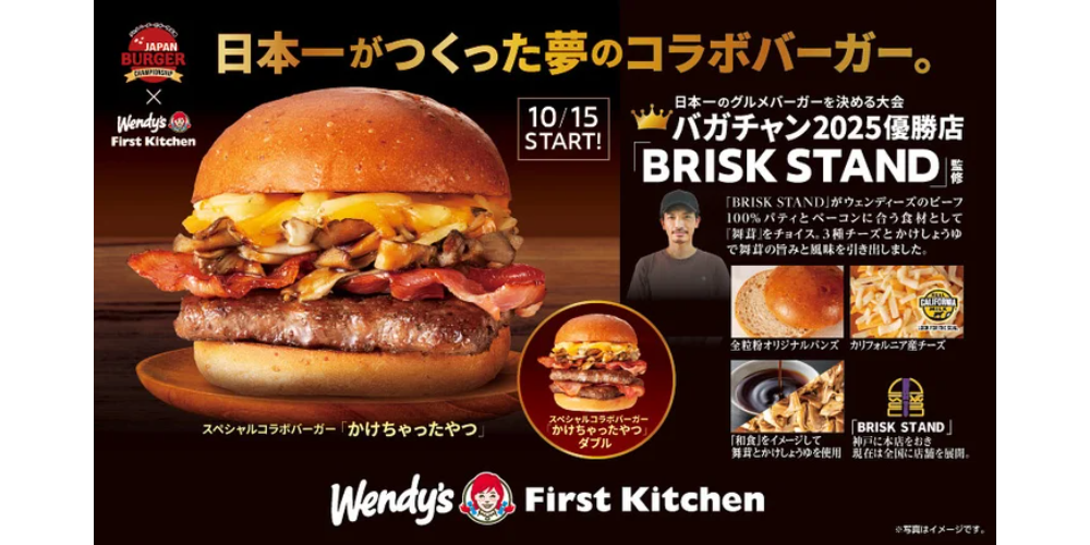 ファーストキッチン株式会社およびウェンディーズ・ジャパン株式会社は、グルメバーガー日本一決定戦「JAPAN BURGER CHAMPIONSHIP 2025」優勝店である「BRISK STAND」とコラボレーションしたバーガー“かけちゃったやつ”を、2025年10月15日(水)から2026年1月中旬まで、全国25店舗で期間限定販売します。
