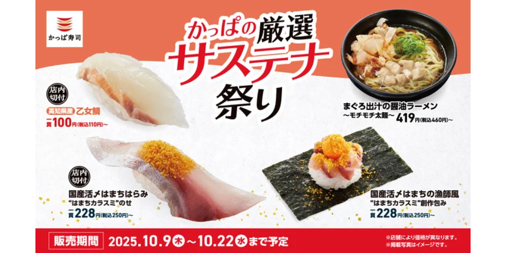 コロワイドグループのかっぱ寿司は、2025年10月9日(木)から10月22日(水)予定で、「かっぱの厳選サステナ祭り」をかっぱ寿司全店にて開催します。