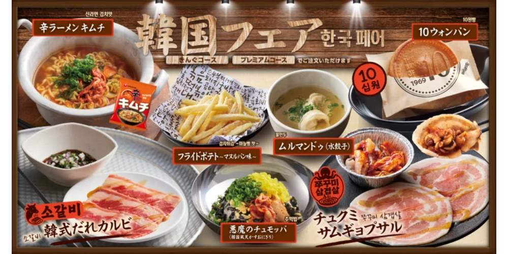 今回の韓国フェアでは「辛ラーメン キムチ」のほか、タコの辛味噌焼きとサムギョプサルを組み合わせた「チュクミサムギョプサル」(590円 税込649円)や、キレのある香味野菜ダレで食べる「韓式だれカルビ」(590円 税込649円)、大人気の「10ウォンパン」(390円 税込429円)なども期間限定で楽しめます。