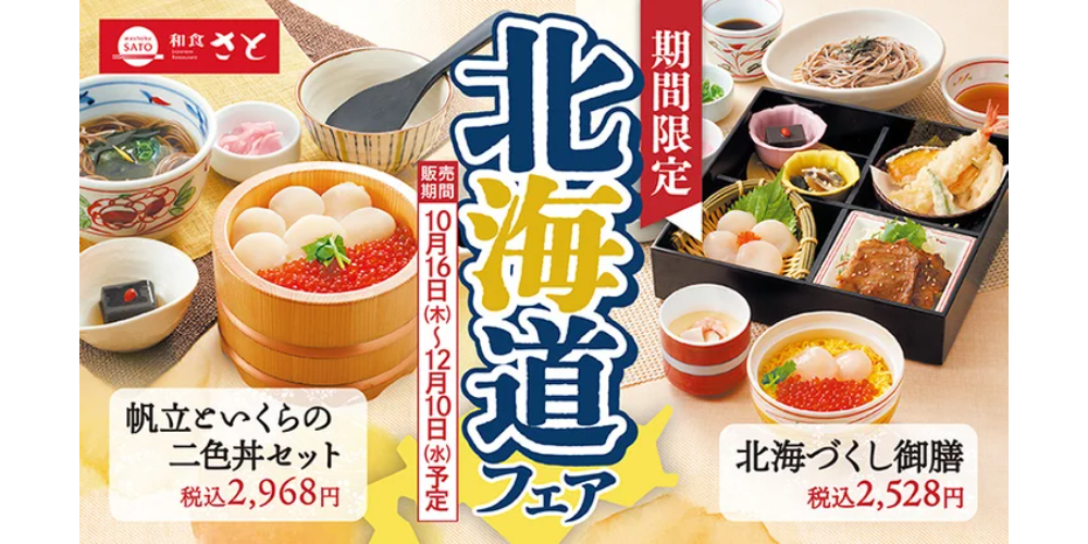 「和食さと」は、2025年10月16日(木)から12月10日(水)までの期間限定で、「北海道フェア」を全国の店舗で開催します。北海道産の帆立貝柱、秋鮭、水だこなどの食材を使用したメニューが登場します。
