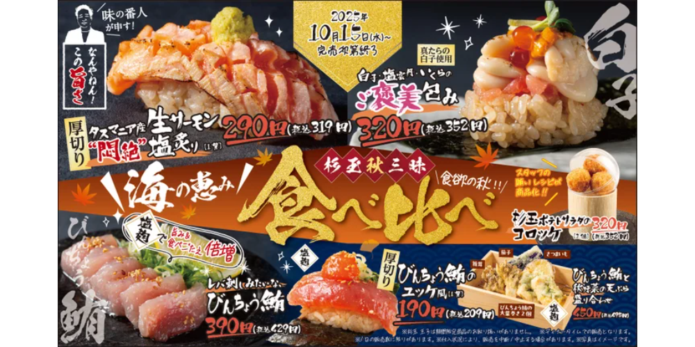 大衆寿司居酒屋「鮨 酒 肴 杉玉」は、2025年10月15日(水)より、厚切りタスマニア産生サーモンや白子を使った贅沢な一品を楽しめるフェア「杉玉秋三昧 海の恵み食べ比べ」を全国の店舗で開催します(一部店舗を除く)。