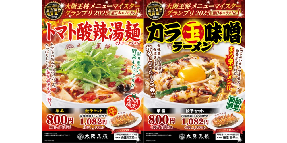 これらの商品は、全国の大阪王将スタッフが「餃子にあう麺メニュー」をテーマに考案した「メニューマイスターグランプリ」で、それぞれ東日本と西日本のグランプリに輝いたメニューです。
