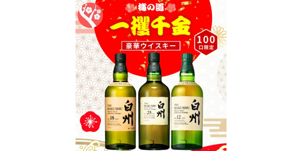 株式会社アップライジングが運営するタチバナE酒販は、超プレミアムウイスキーくじの最新作「【100本限定】【一攫千金 梅の道 1%の頂へ 】」を発売中です。サントリーのシングルモルト「白州」に焦点を当てたこのくじは、100口限定で販売され、ジャパニーズウイスキーの最高峰の一つとされる「白州25年」が超大当たりとして設定されています。