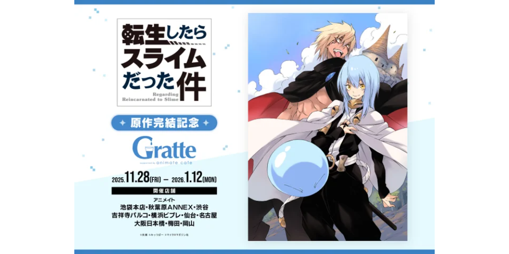 マイクロマガジン社は、GCノベルズ『転生したらスライムだった件』の原作小説完結を記念し、アニメイトカフェGratteとのコラボレーション企画を2025年11月28日(金)から2026年1月12日(月)まで開催します。原作小説最終巻となる『転生したらスライムだった件 23』は、11月29日に発売されます。